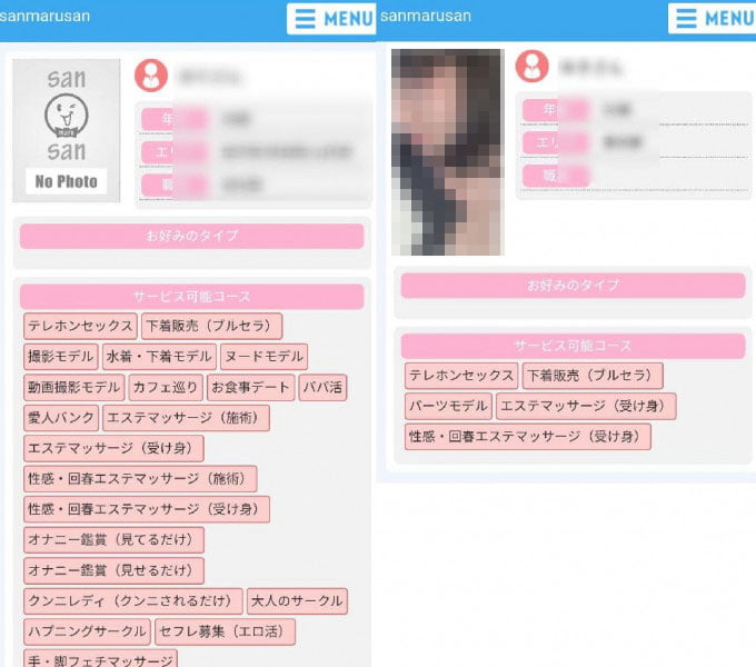 で、色々サービスを見ていくと気になったのが、「パーツモデル」と「下着販売」です。いわゆる「ブルセラ」「染みパン」というやつですね。